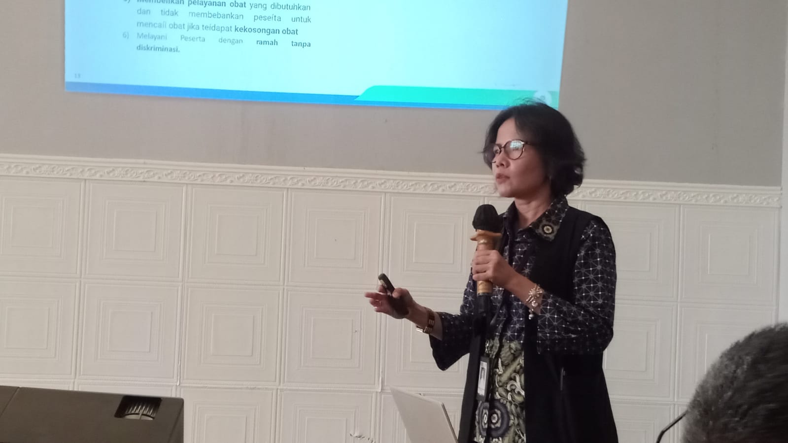Selain menjelaskan pemanfaatan Aplikasi Mobile JKN, Betty menambahkan penjelasan terkait kanal layanan informasi salah satunya petugas BPJS Siap Membantu (SATU) di rumah sakit.
