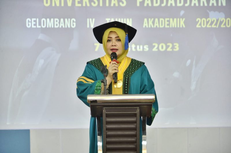Hj. Indah Dhamayanti Putri SE, M.IP, Saat memberikan Pesan dan Kesan mewakili Alumni pada acara Pelepasan Wisudawan di Aula Fakultas Ilmu Sosial dan Ilmu Politik (FISIP) Kampus Unpad Jatinangor Bandung, Pada Senin, (07/08/2023).