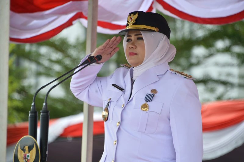Bupati Bima Hj. Indah Dhamayanti Putri, SE, M.IP selaku inspektur upacara yang mengenakan Pakaian Dinas Upacara (PDU) memimpin upacara yang berlangsung khidmat tersebut.
