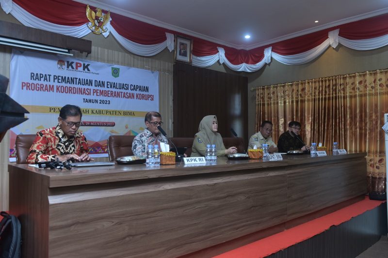 Kab. Bima, internewstoday.com – Rapat Pemantauan dan Evaluasi Capaian Program Koordinasi Pemberantasan Korupsi di kabupaten Bima dengan Tim KPK yang dibuka secara resmi oleh Bupati Bima Hj.Indah Dhamayanti Putri, SE.,M.IP Selasa (29/8/2023) di Ruang Rapat Utama Kantor Bupati Bima membahas capaian pada 8 area intervensi pemberantasan korupsi.