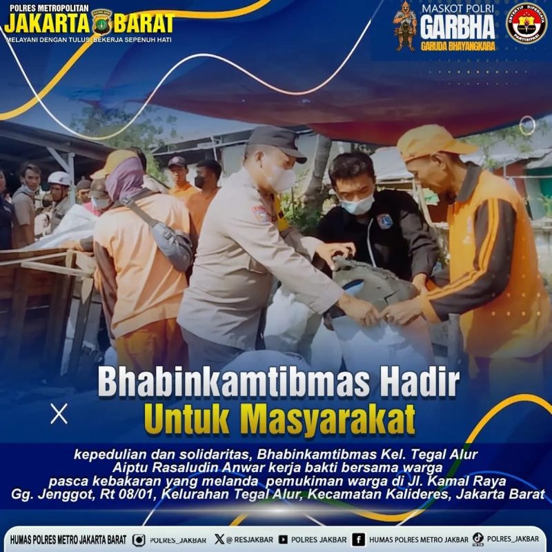 Salah satunya yang dilakukan oleh bhabinkamtibmas Tegal alur polsek Kalideres Aiptu Rasaludin anwar yang hadir dalam kegiatan kerja bakti massal pasca kebakaran yang melanda pemukiman masyarakat di Jl. Kamal Raya Gg. Jenggot, Rt 08/01, Kelurahan Tegal Alur, Kecamatan Kalideres, Jakarta Barat pada hari Rabu, 20 September 2023, sekitar pukul 14.00 WIB.