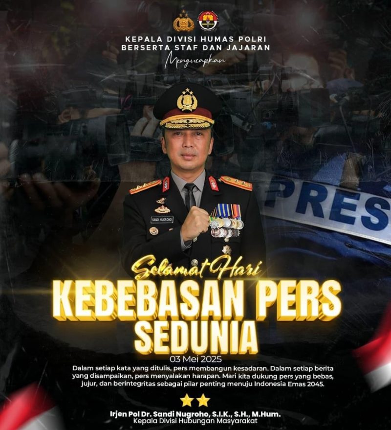 Ucapan selamat ini bukan sekadar formalitas, melainkan sebuah penegasan komitmen Polri dalam menghargai dan mendukung kebebasan pers sebagai salah satu pilar demokrasi. Mari kita jadikan momentum ini sebagai penguat sinergi antara pers, pemerintah, dan seluruh masyarakat, demi mewujudkan Indonesia yang cerdas, berkeadilan, dan sejahtera. Selamat Hari Kebebasan Pers Sedunia.